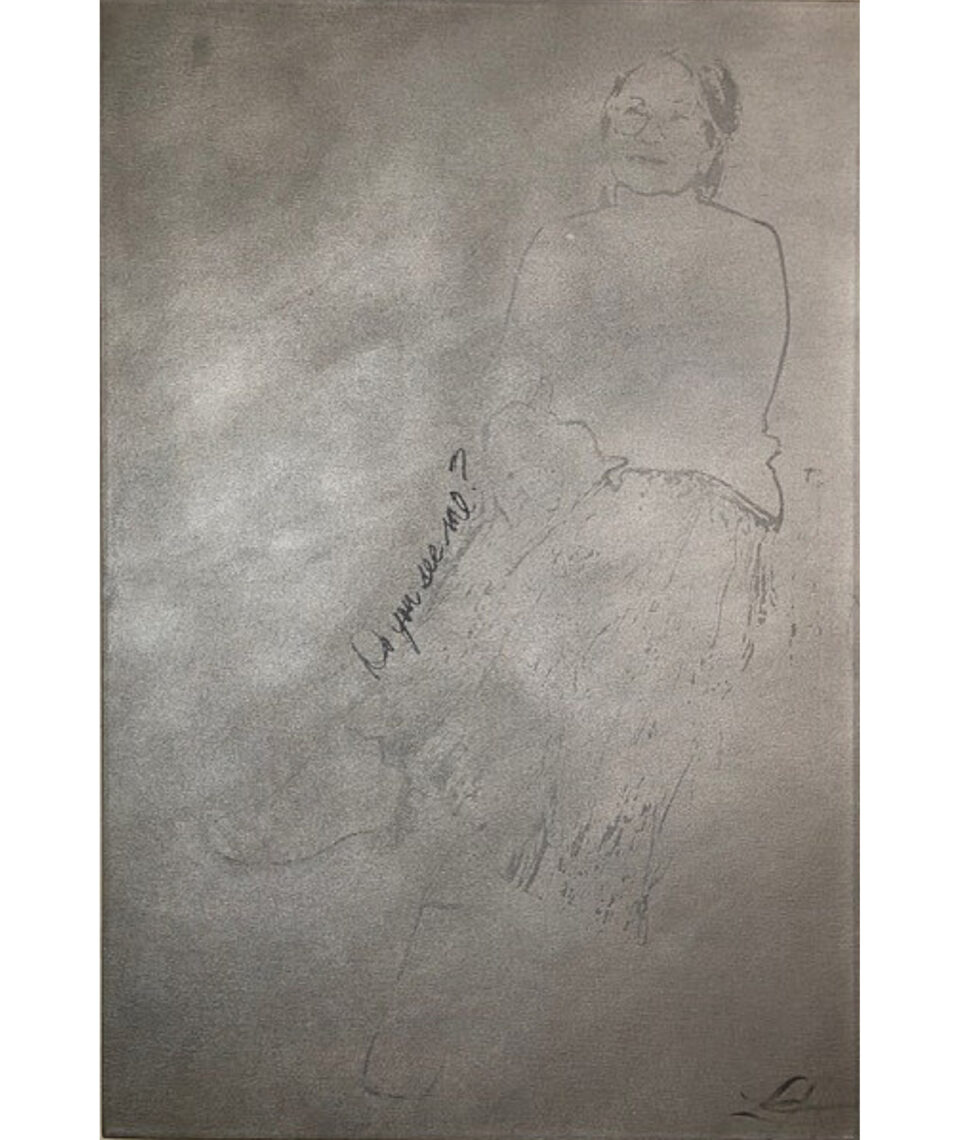 Skin tones are worked in paynes grey in respect to the great grandmother. The lack of realistic