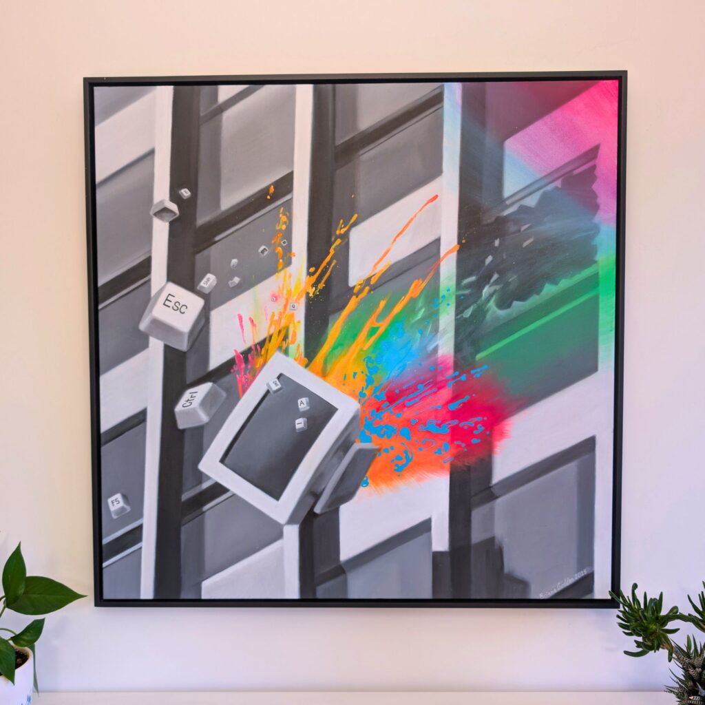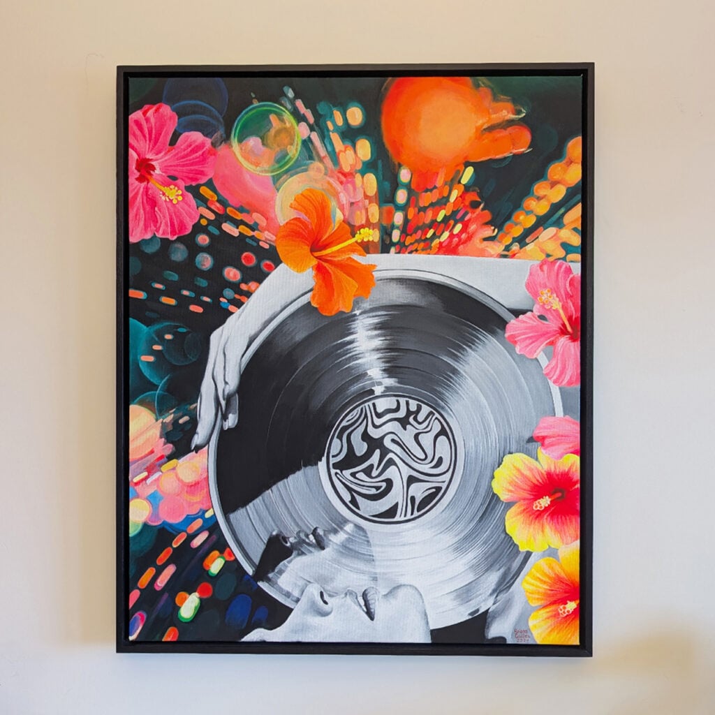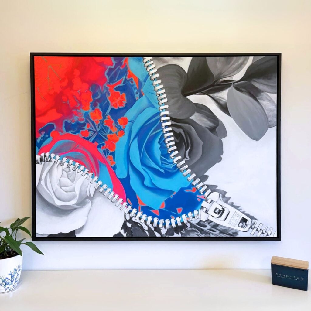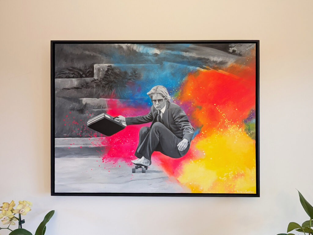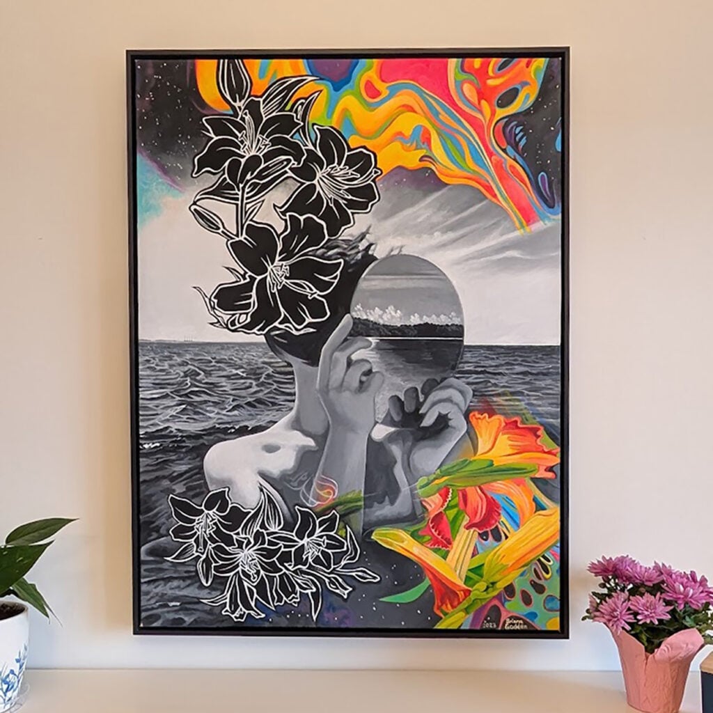 Godden’s paintings are defined by a signature combination of black-and-white subject matter punctuated by hyper-vivid colour. She uses digital collage as a foundation, reimagining and remixing nostalgic imagery into distinct conceptual works. These designs serve as a reference only, which she then freehand paints on canvas. Her artworks create a sense of transformation, nostalgia, and wonder, reframing familiar scenes through a surreal lens that invites emotional and narrative depth. The Art of Surreal Life encapsulates the conceptual language of her practice.
