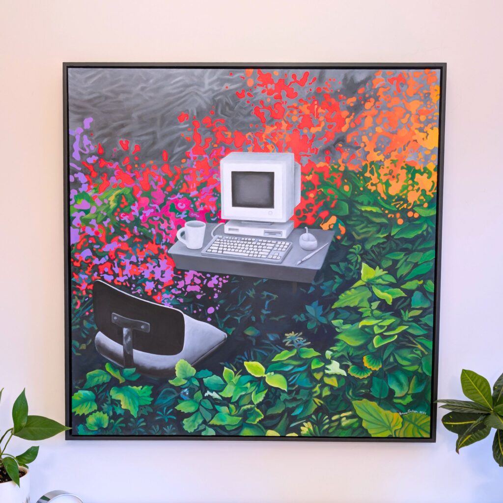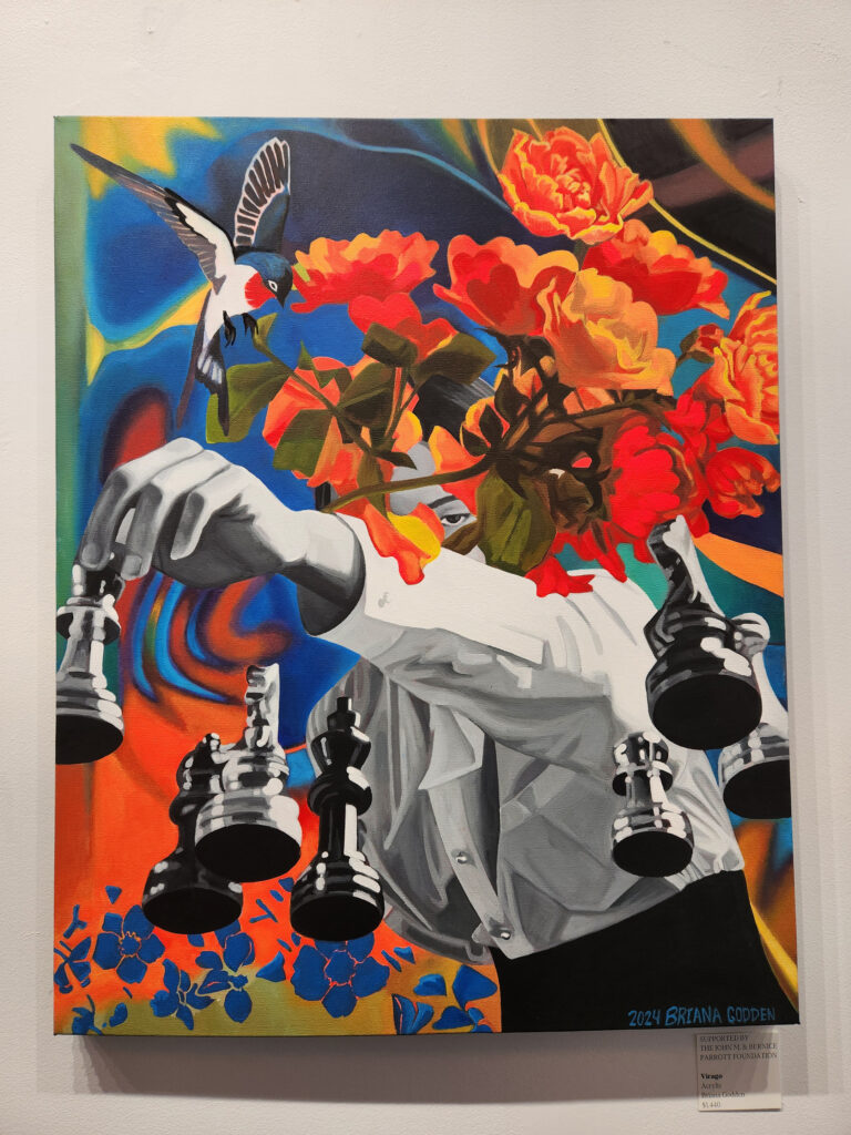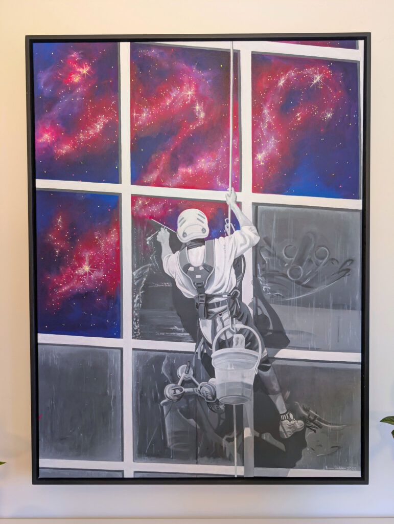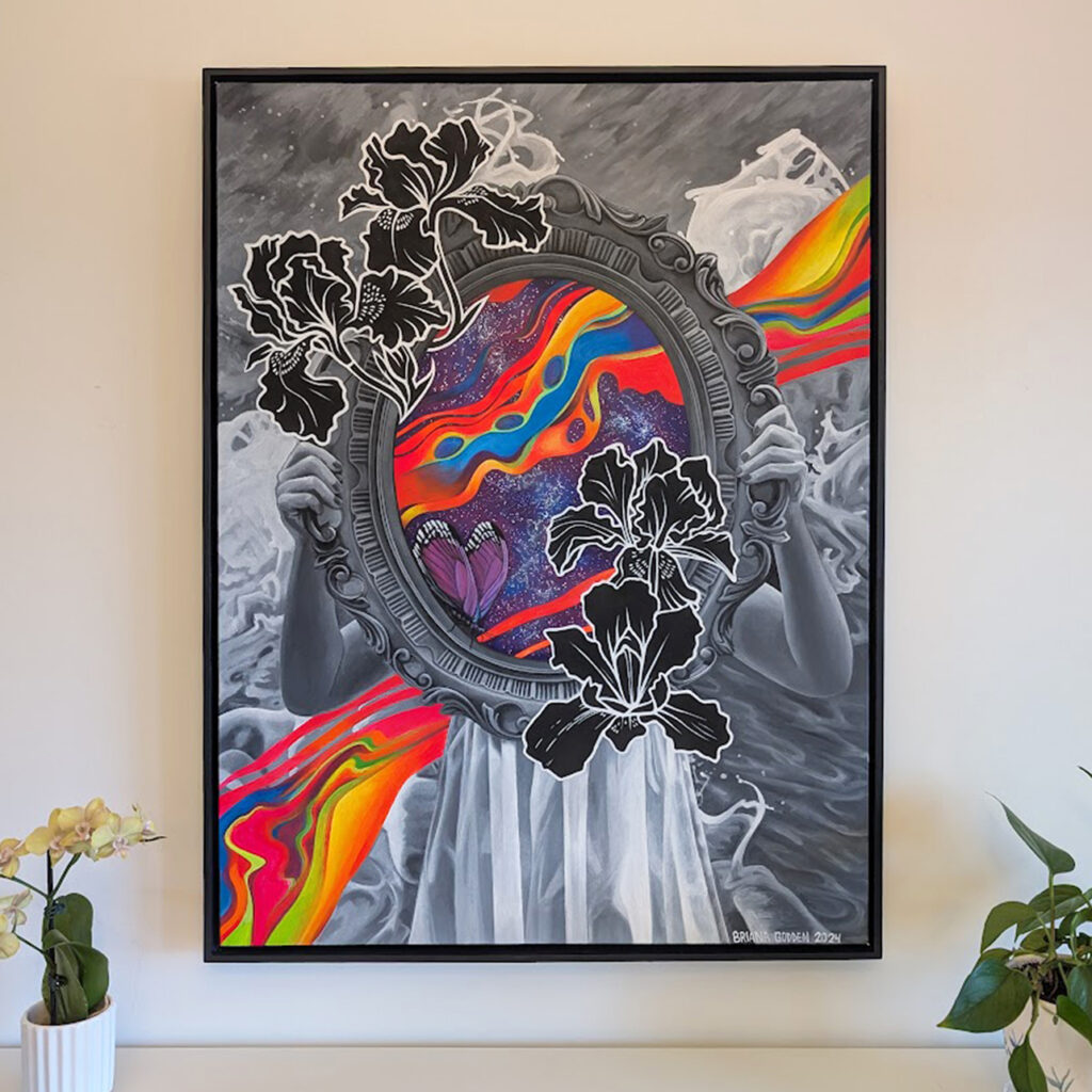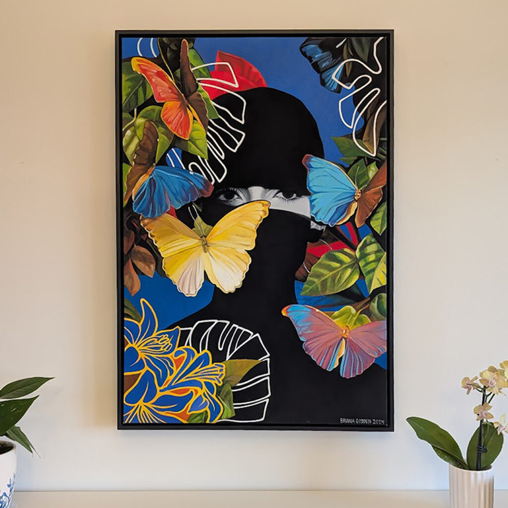 Briana Godden’s artwork is a blend of the contemporary and surreal with compelling storytelling. Each of her paintings begins as a digital collage, designed from found images, which she then freehand paints onto canvas with vivid colour—creating transformative artworks that spark imagination and invite viewers to discover more wonder.