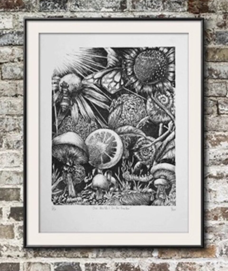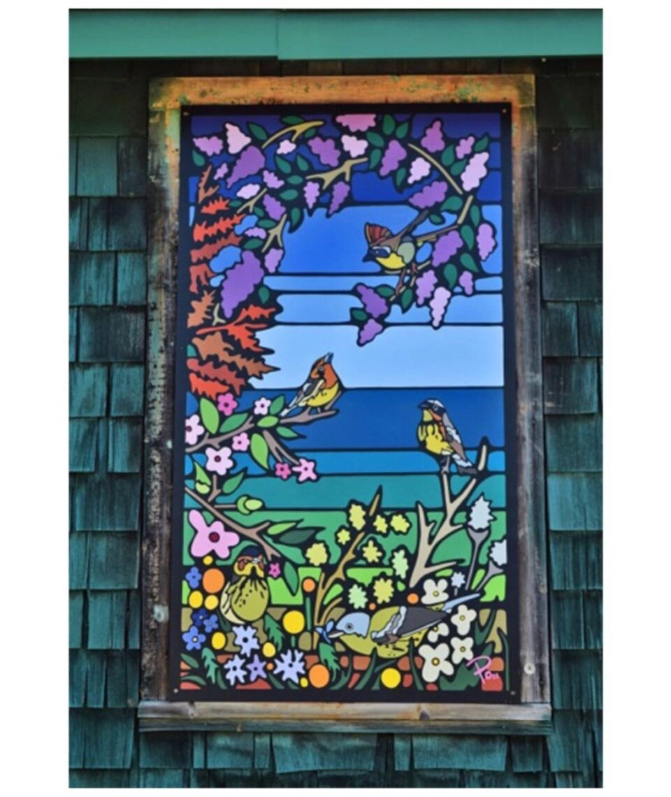 Po works in a wide range of mediums, including digital illustration, oil painting, printmaking, quilting, installation sculpture, and traditional Indigenous practices such as drum making (to name a few). One of her most recent works, a mural titled “Warbler Watching,” can be found in the Aviator’s Garden at Base 31 in Picton, ON. Po’s current ongoing project is creating a series of 15 handcrafted drums using traditional methods and raw materials. Po regularly posts about her creative process and the thinking behind her current projects on her website.