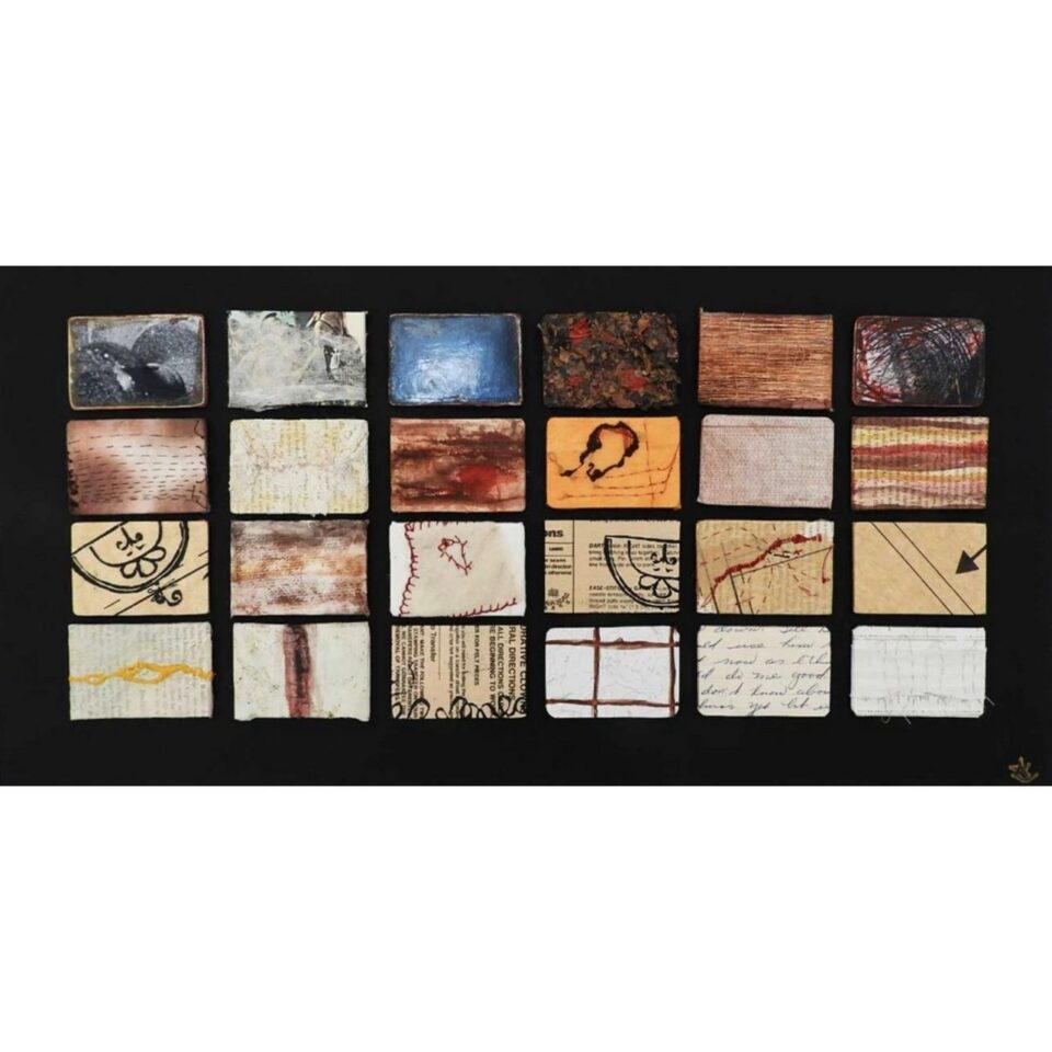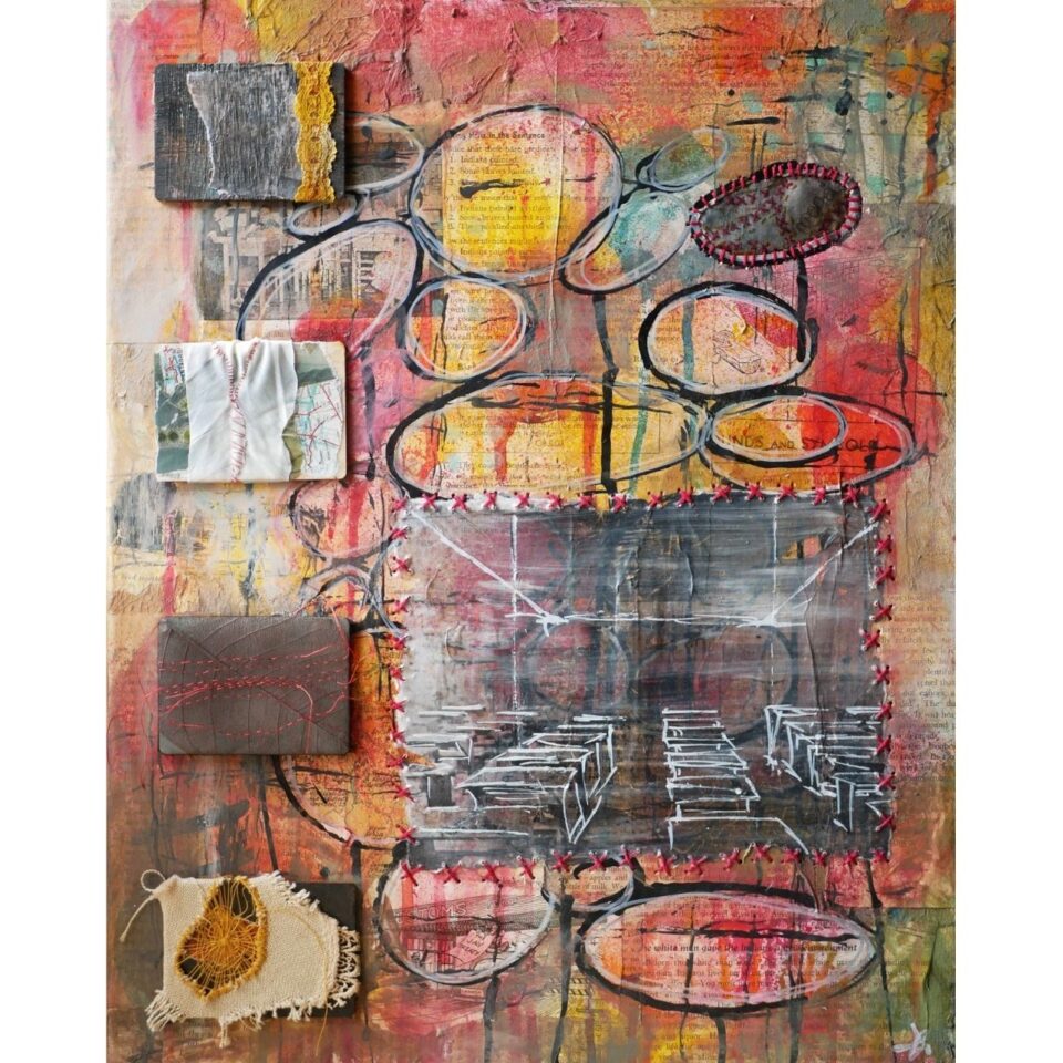 Lynn learned to do printmaking in high school and continued to explore that creative outlet through her university courses at the Ontario College of Art and Design and York University’s Fine Arts Studio Program. When she started her family, it became more difficult to manage printmaking, given the space and materials required. She started incorporating printmaking on a smaller scale and layering in mixed media and textiles, then assembling smaller pieces into larger artworks.